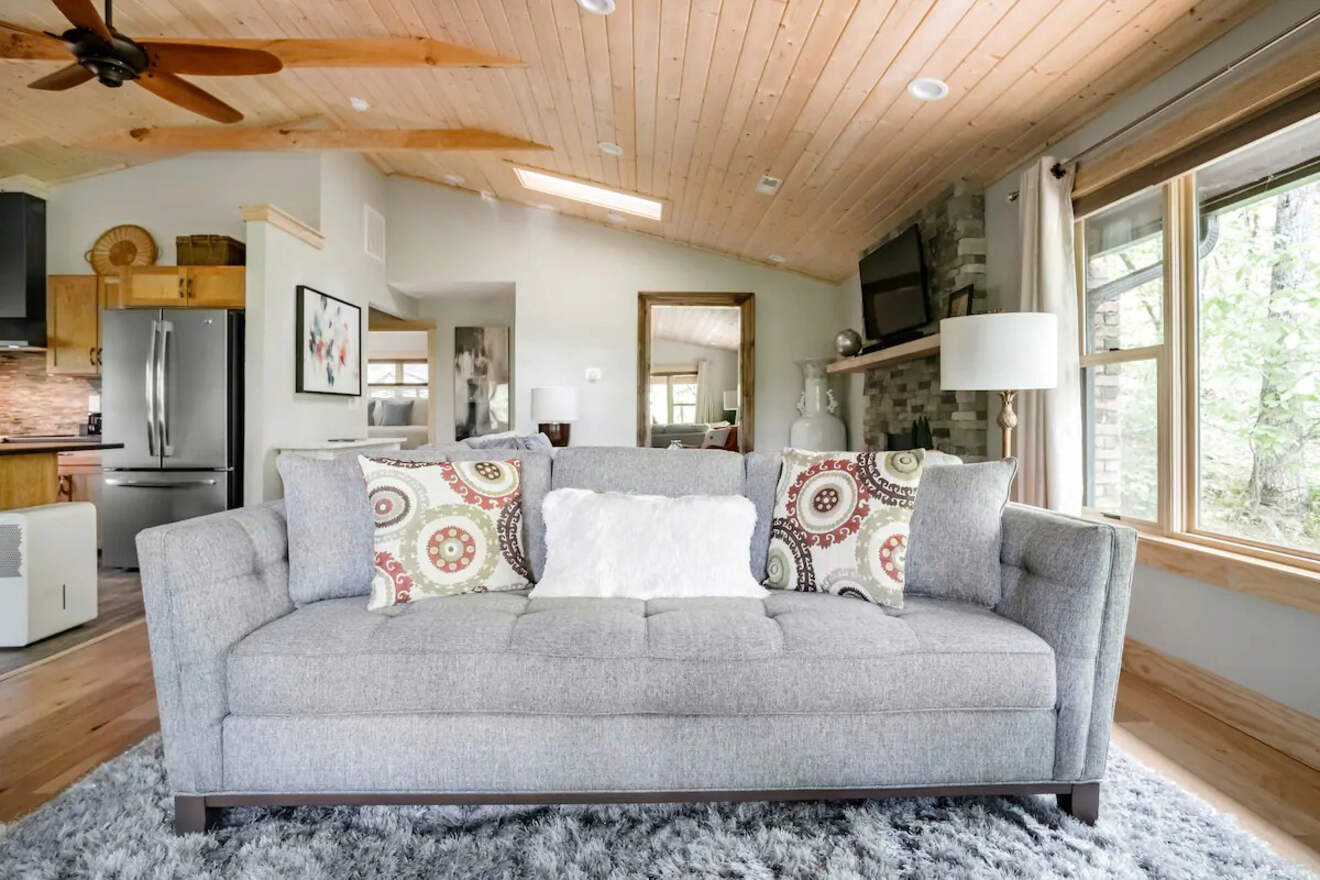 Este idílico Airbnb en Asheville fue diseñado para optimizar la vida tanto en interiores como en exteriores. Tiene una calificación excelente, y es fácil entender por qué. La fogata exterior ofrece una vista increíble de los árboles verdes (o blancos, según la temporada) que cubren las montañas. En el interior, encontrará una cocina completa, antigüedades, lujosos sofás modernos y un ambiente de paz.