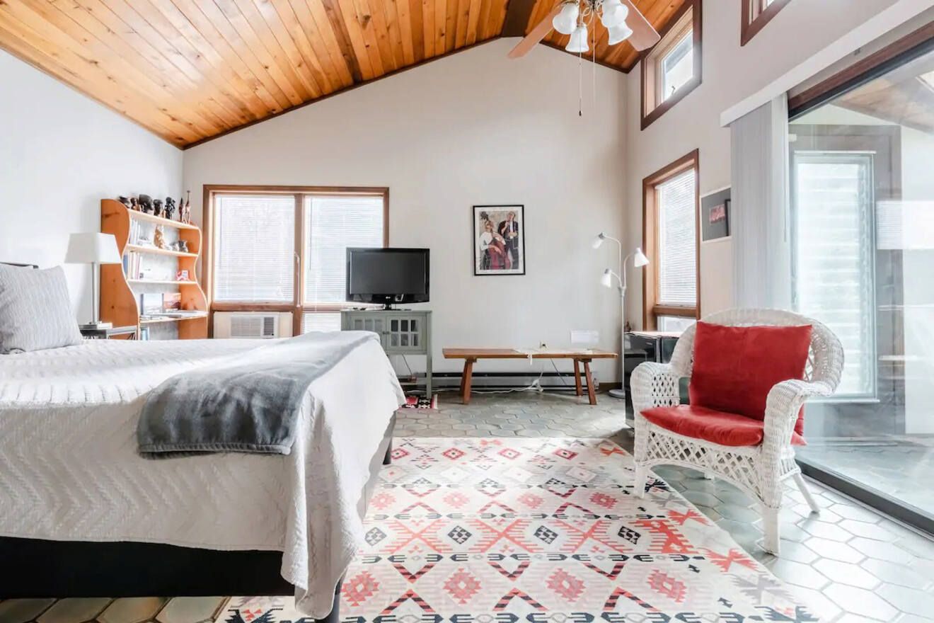 Aunque su excelente ubicación parezca el mayor atractivo de este Airbnb en Asheville, entra y verás que no se queda atrás. Con techos altos, enormes ventanales y acabados de madera, esta casa única es prácticamente perfecta. Y cuenta con una cocina completa, así que no tendrás que irte ni siquiera cuando te empiece a rugir el estómago.
