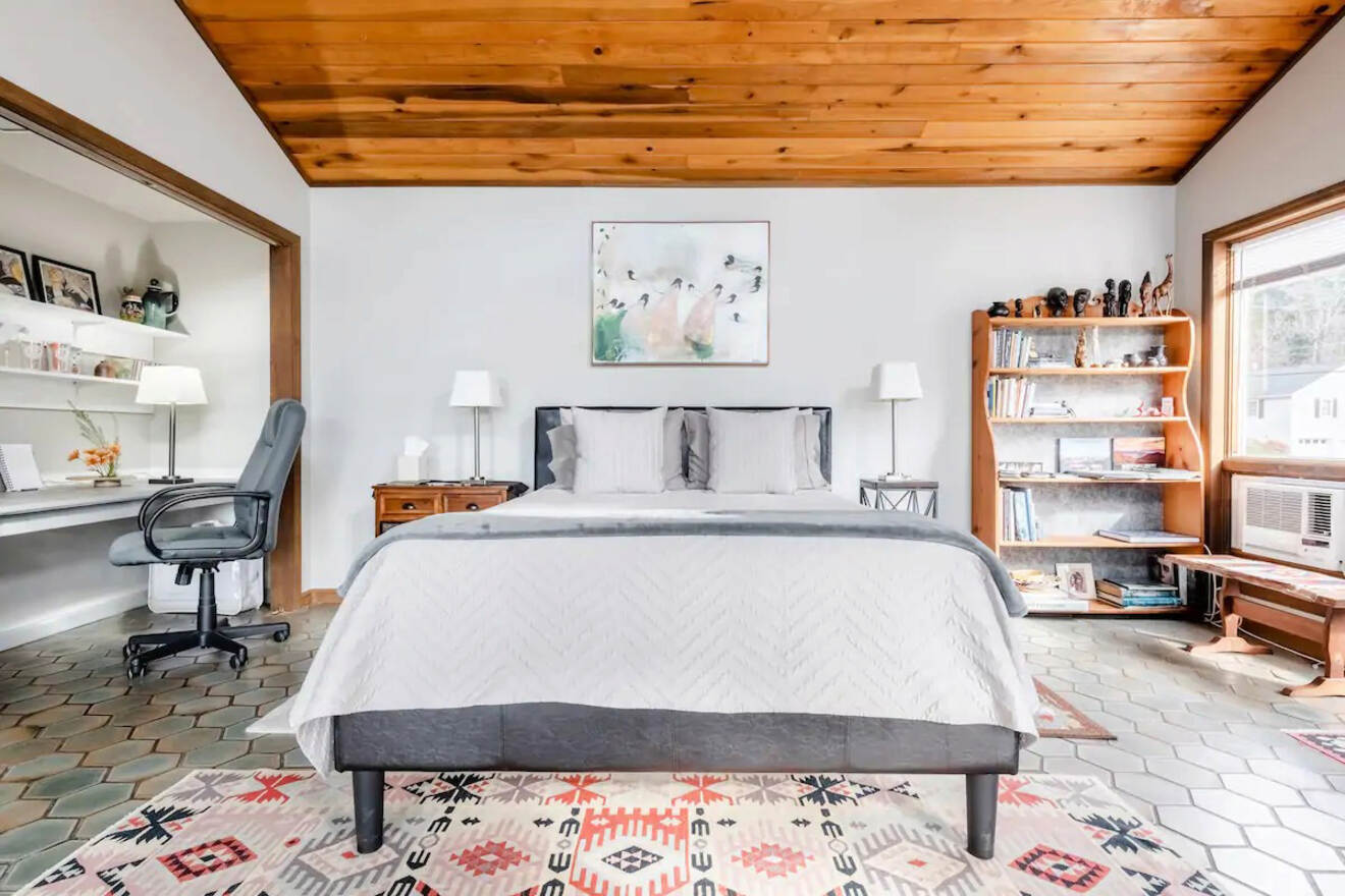 Este Airbnb en Asheville es sencillo, pero tiene todo lo que necesitas, incluyendo privacidad y un práctico espacio de trabajo. La casa se ilumina aún más gracias a sus acabados de madera, abundante vegetación y un suelo de baldosas único.