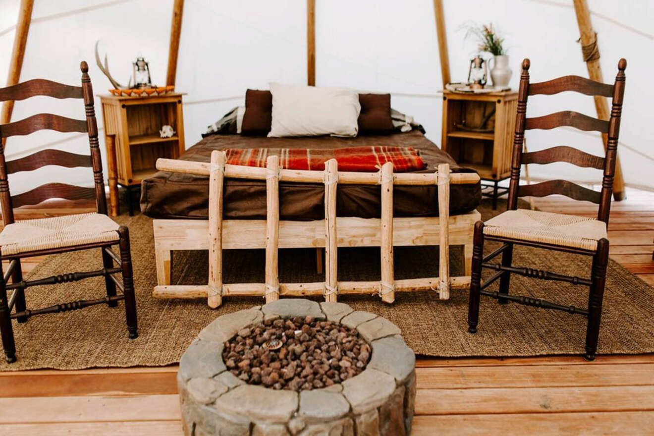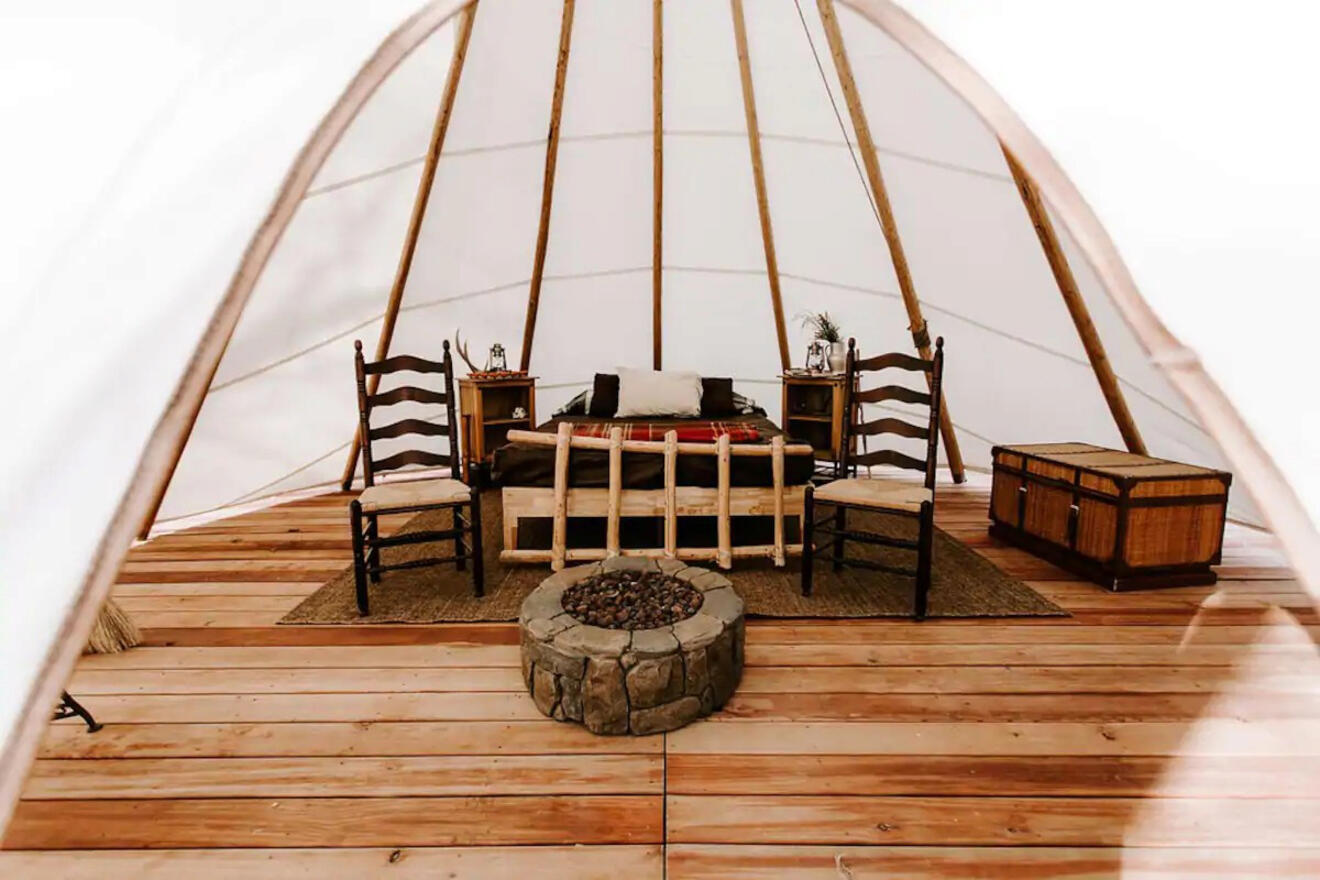 ¡Otro tipi! Esta vez, dormirás en este tipi único de Airbnb. A pesar de lo que podrías esperar, es un lugar bastante amplio, con capacidad para hasta cuatro personas. No tiene dormitorios, pero hay suficiente espacio para que todos puedan dormitar, comer en la mesa del comedor y sentarse alrededor de la pequeña fogata interior.