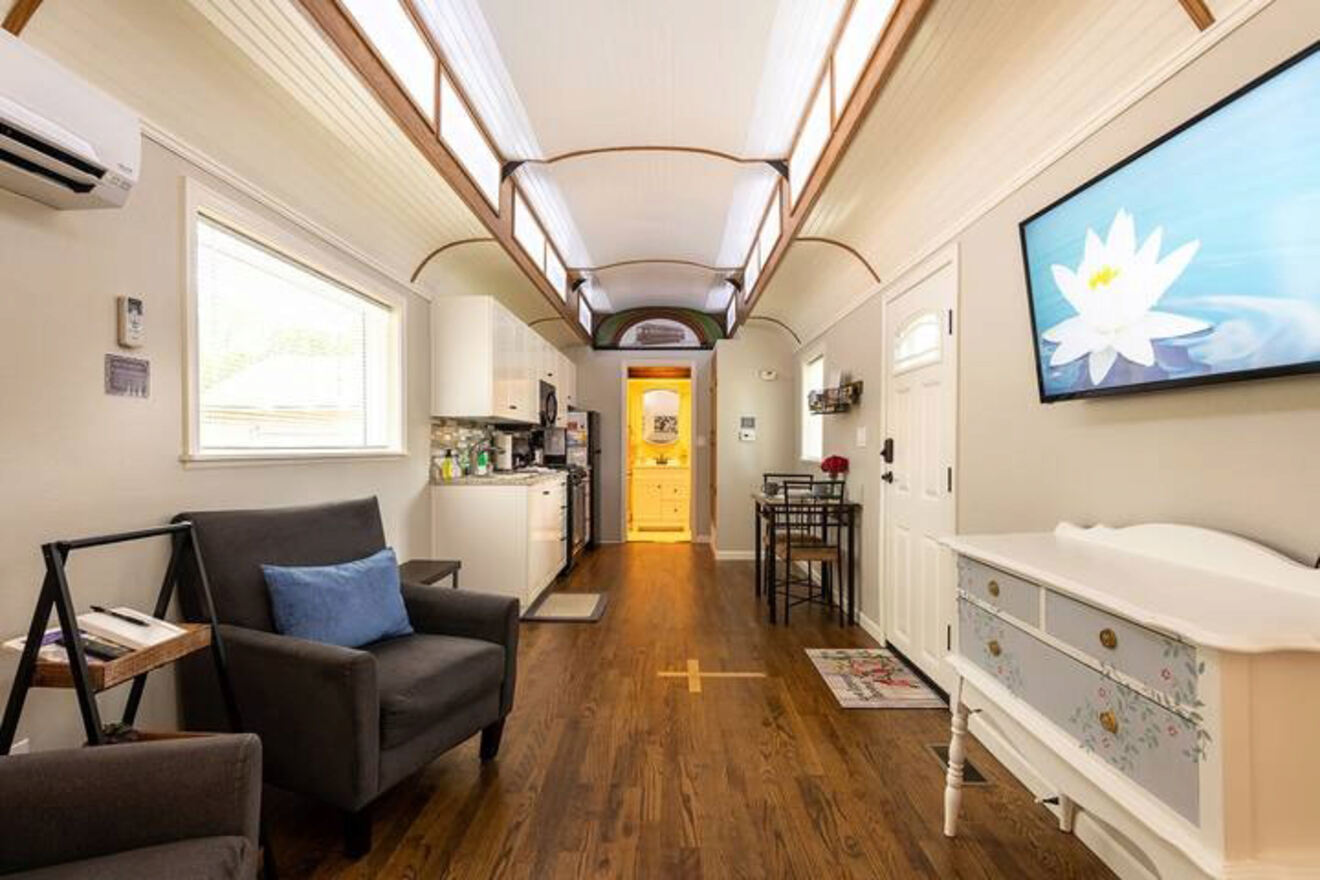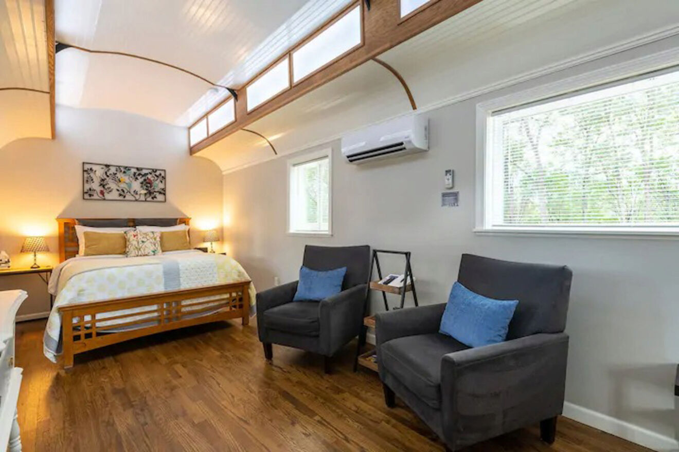 Puede que no sea una cochera histórica, pero su elegante y moderno interior lo compensa. Incluye una cama tamaño queen, una pequeña sala de estar y una cocineta. También cuenta con aire acondicionado para refrescarse durante los calurosos meses de verano.