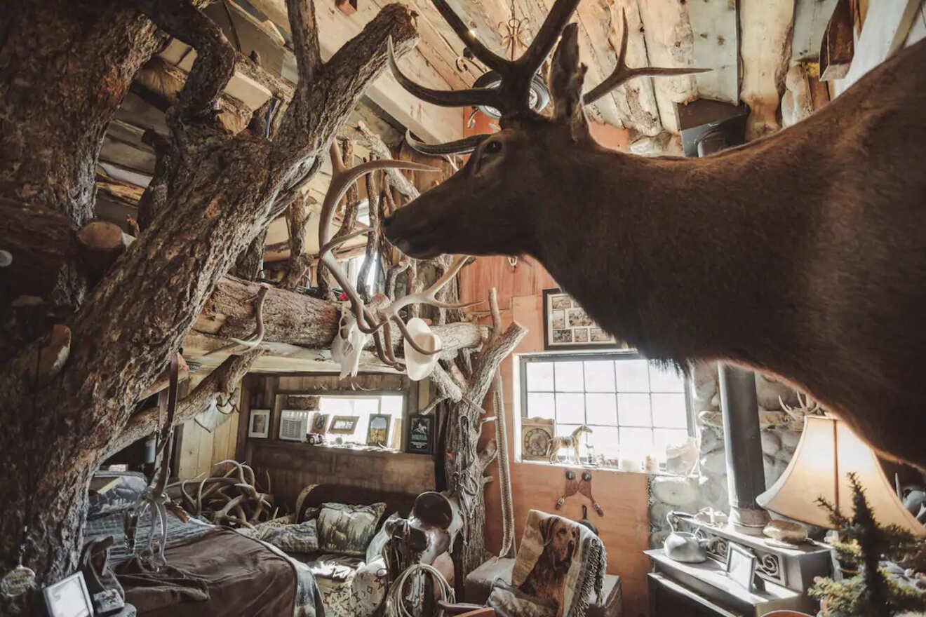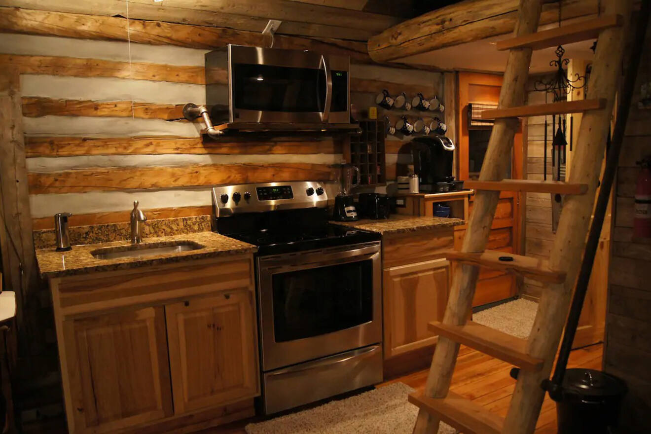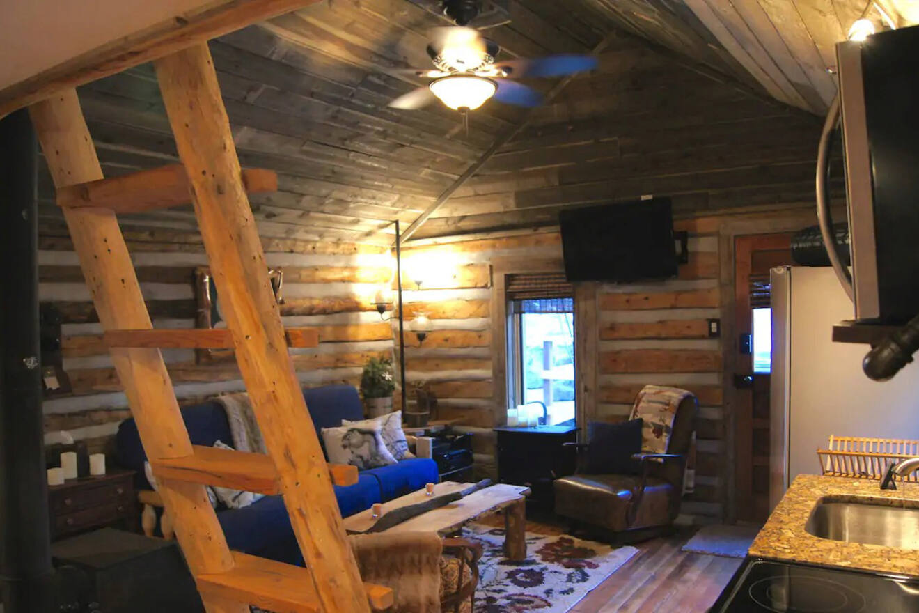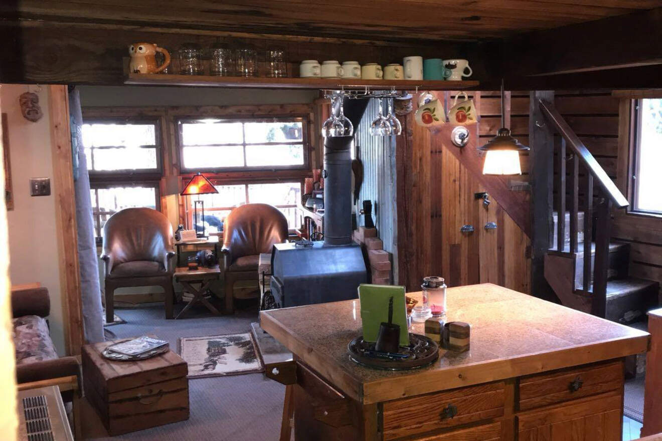 El último lugar en mi lista es la opción más rústica. Es perfecta para quienes buscan una auténtica cabaña de troncos de las Montañas Rocosas. ¡Incluso hay una estufa de leña antigua en el interior para mantenerte caliente! Las familias aventureras que quieran disfrutar de la naturaleza deberían considerarla.