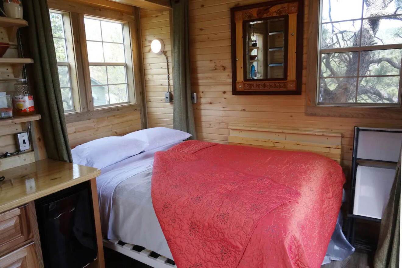 Esta apartada Casita Roja del Árbol es una excelente opción para parejas que desean alojarse lejos de las principales ciudades de Colorado. Disfrute de un despertar tranquilo en su cama plegable tamaño queen antes de dirigirse a la cocina exprés para prepararse un café. Después, siéntese en su balcón privado mientras admira las impresionantes vistas.