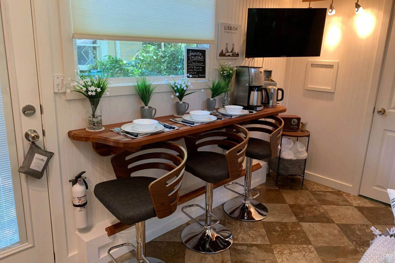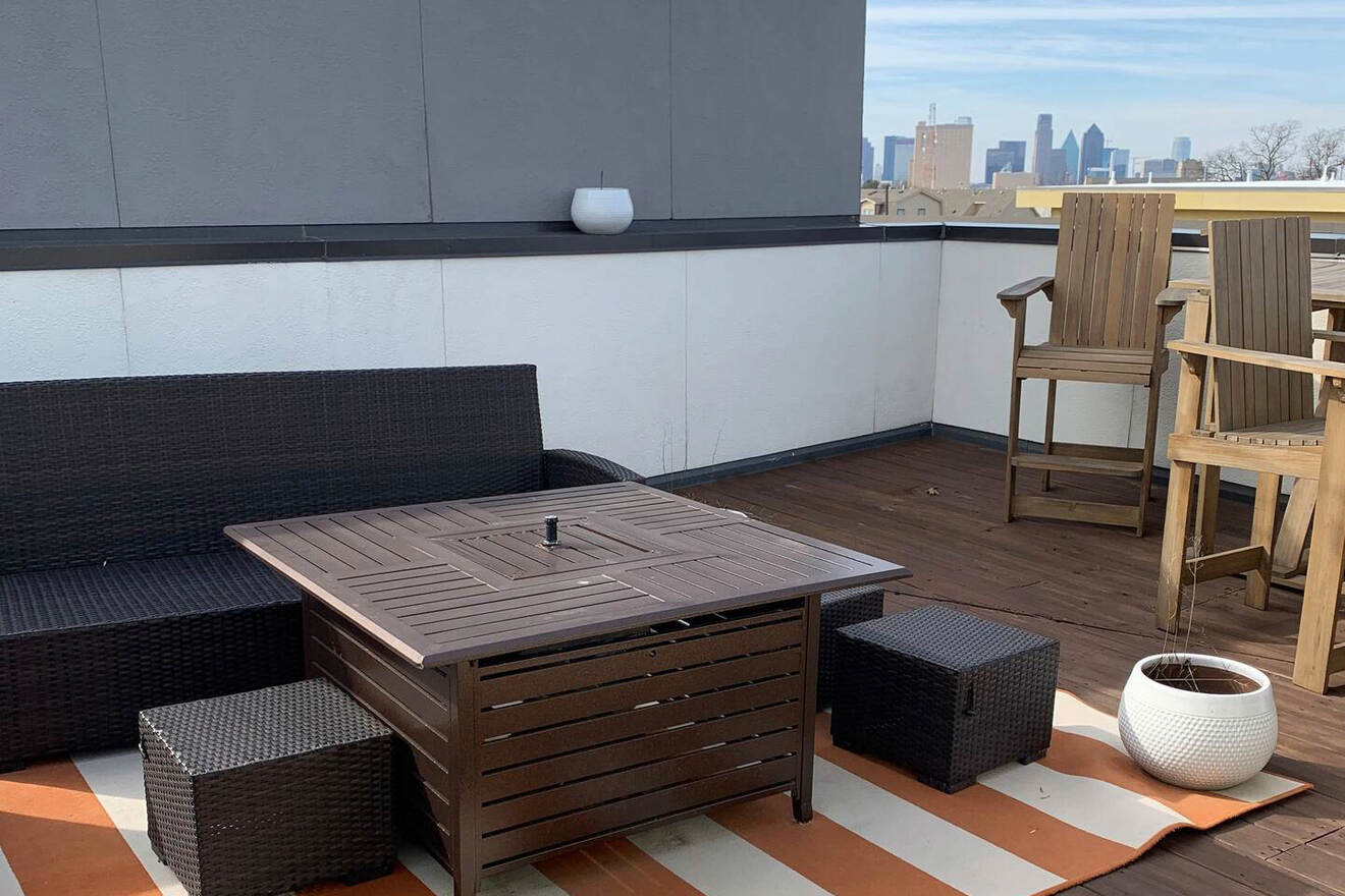 No es frecuente encontrar alquileres vacacionales tan bonitos cerca del centro de Dallas a un precio tan asequible. Esta pintoresca casa de Airbnb se encuentra en el patio trasero de la casa del anfitrión, pero tiene su propia terraza con una impresionante vista del horizonte de la ciudad.