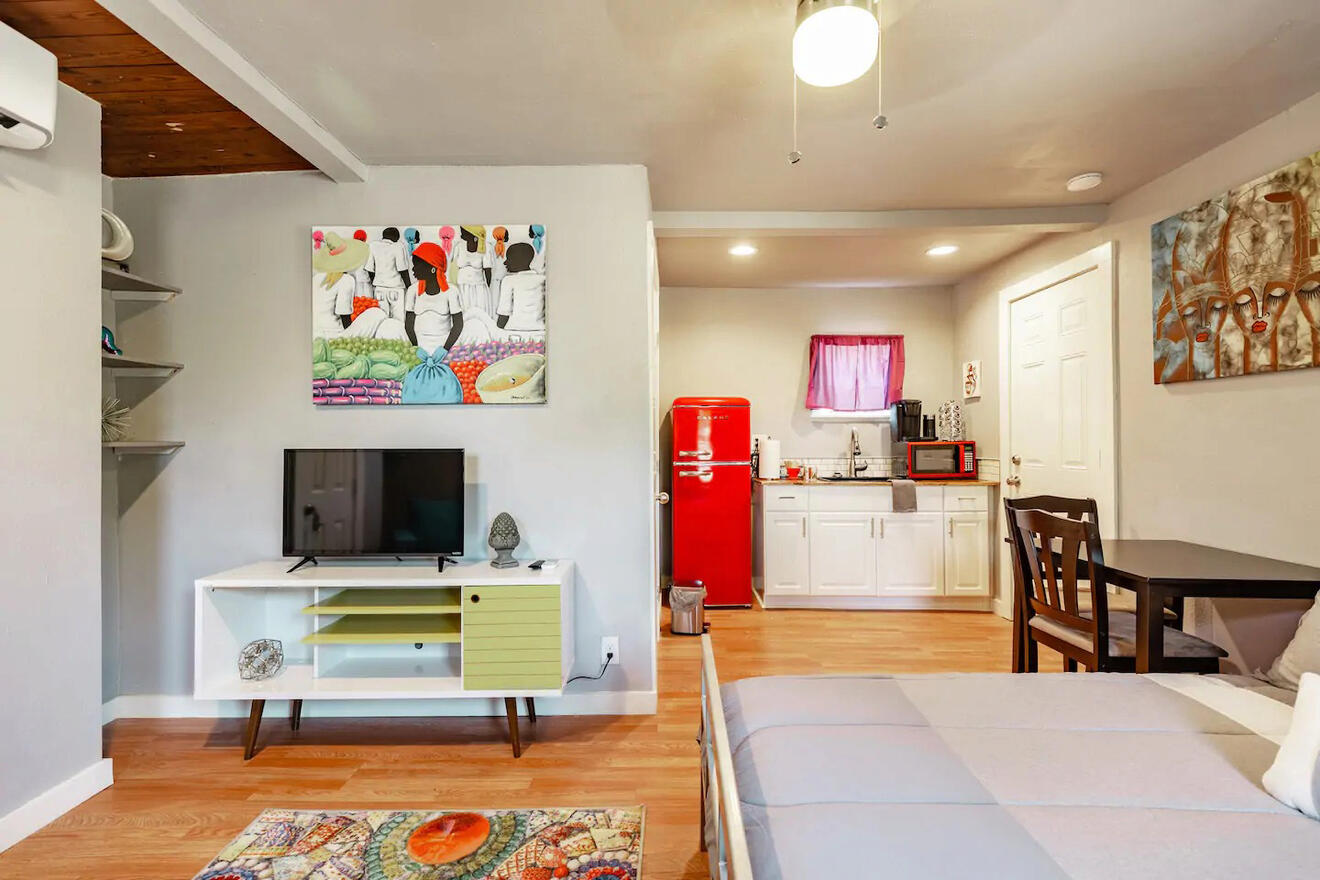 Este moderno Airbnb es perfecto para cualquier mujer que quiera viajar a Dallas y vivir una experiencia vibrante. La anfitriona ha creado un espacio moderno y moderno en este hostal de Deep Ellum.
