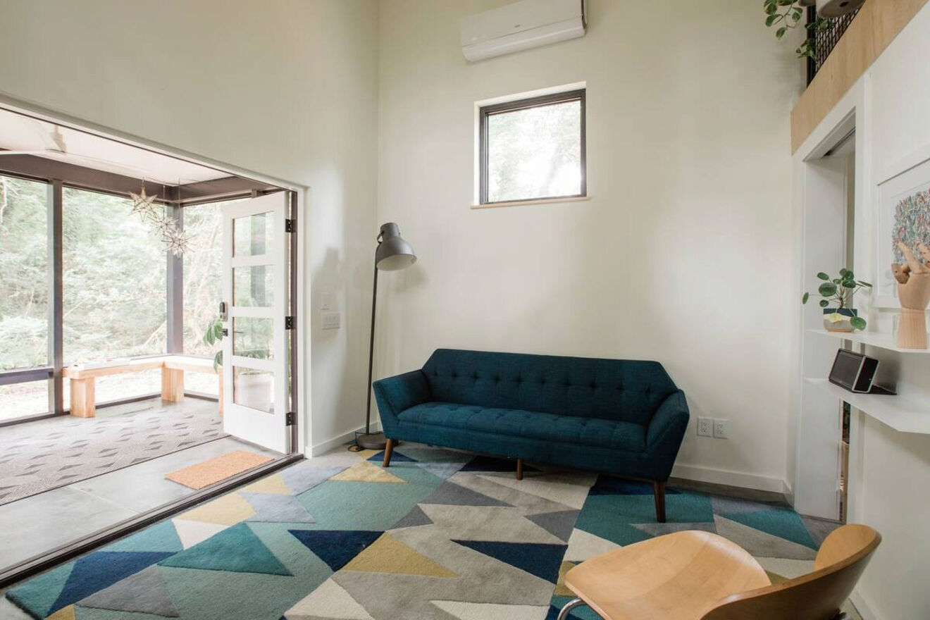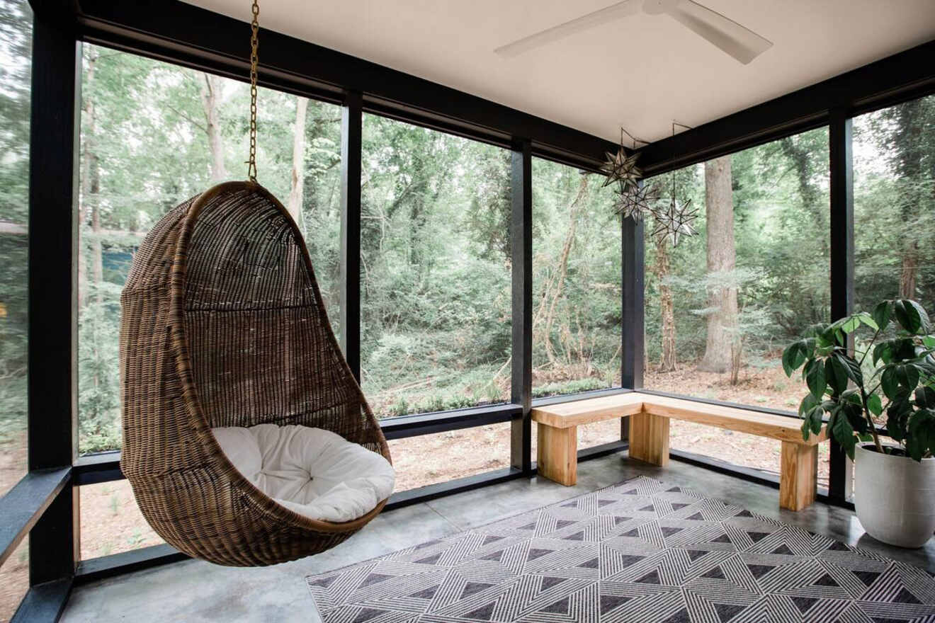 Aunque es una casa diminuta, cumple todos los requisitos para una estancia de lujo en Durham. Enclavada entre los árboles, esta casa deja entrar mucha luz gracias a sus amplios ventanales que dan al bosque. Y para apreciar aún mejor la vista, puedes acomodarte en el sillón burbuja colgante.