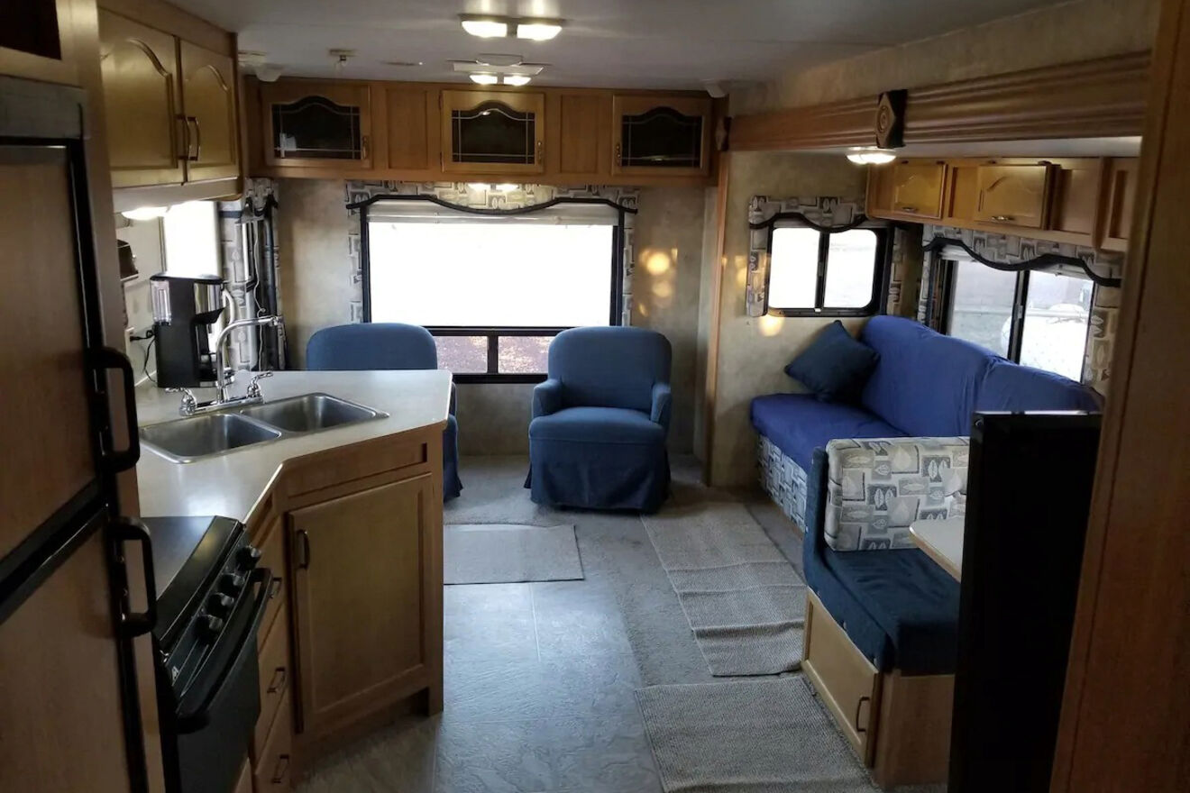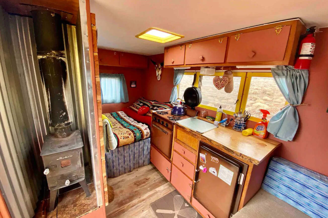 Encontrarás este camión solar en la naturaleza de Arizona. Es increíble lo bonito que es por dentro, con diseños bien pensados y donde encontrarás todo lo que necesitas: una cama cómoda, una sala de estar relajante y una minicocina. ¡Esto demuestra que tu espacio no tiene que ser grande, solo inteligente!