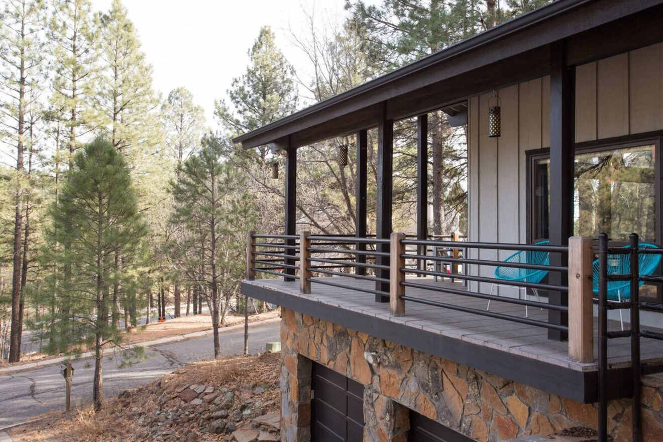 La amplia terraza envolvente de esta cabaña con vista a los árboles ofrece un paisaje impresionante. Y con coche, estarás a aproximadamente 1 hora y 15 minutos de la entrada del Borde Sur del Gran Cañón.