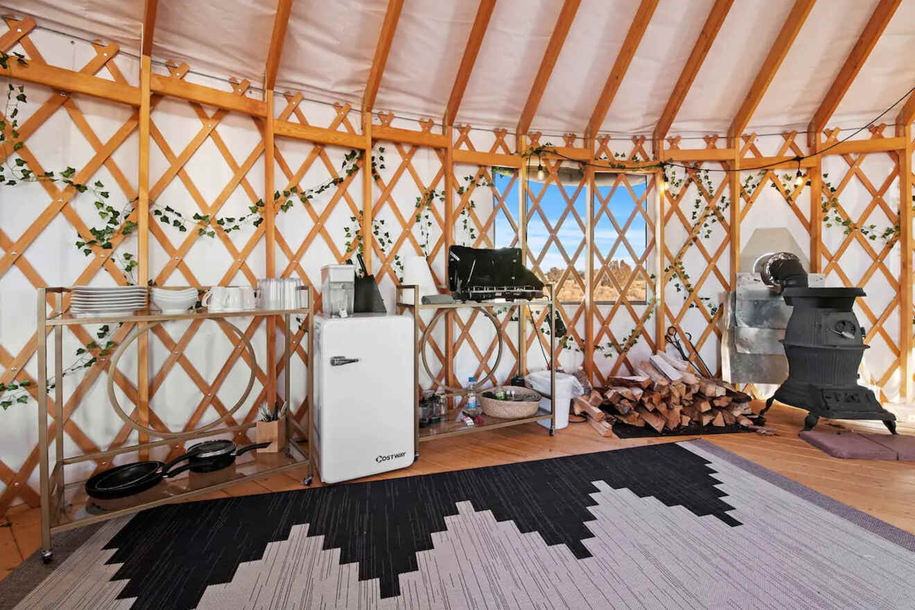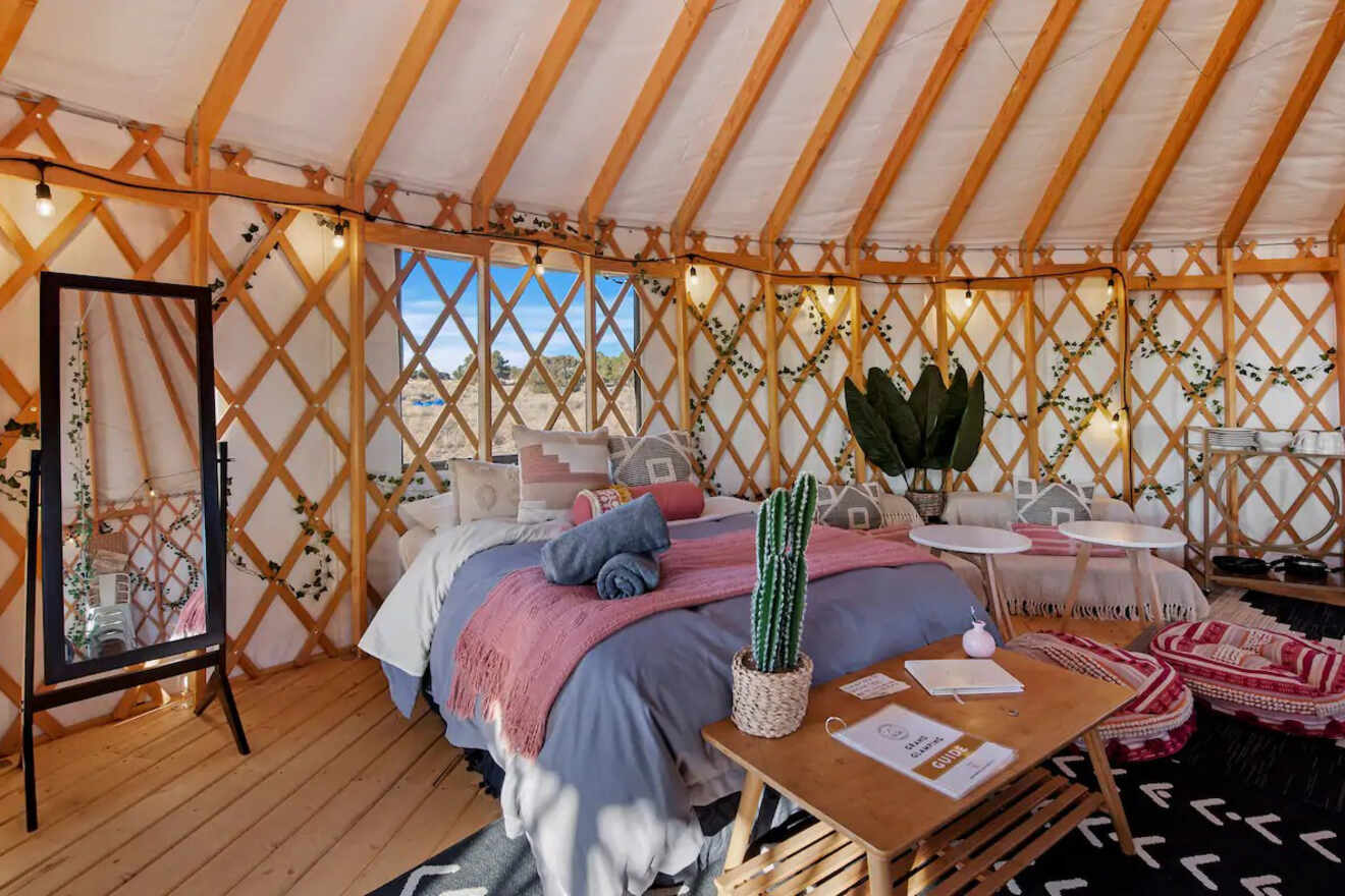La experiencia de glamping suele estar reservada para grupos pequeños, con el espacio limitado habitual en las tiendas de campaña. Este Airbnb es diferente. Es una yurta espaciosa, con techos que se elevan a gran altura.