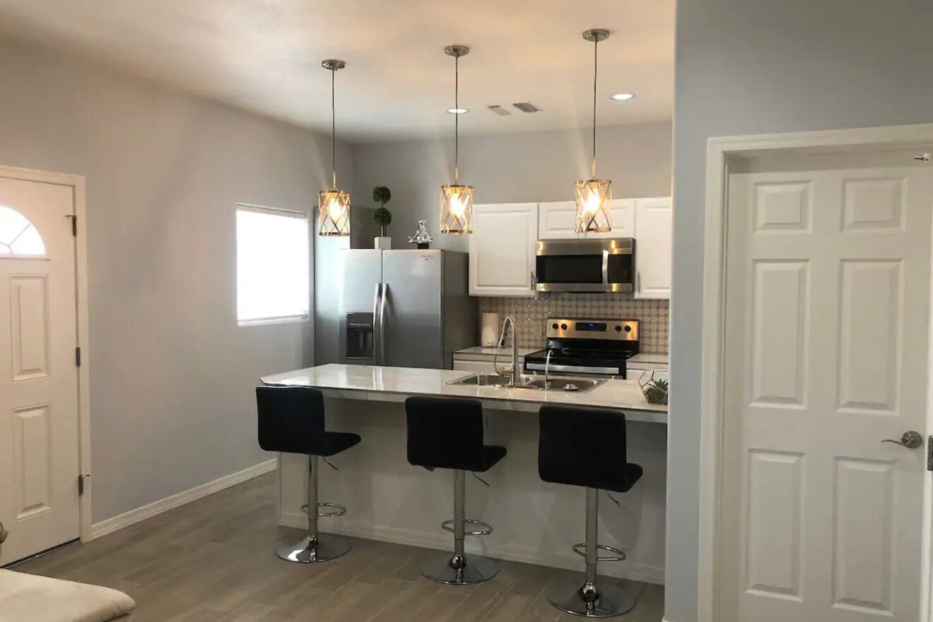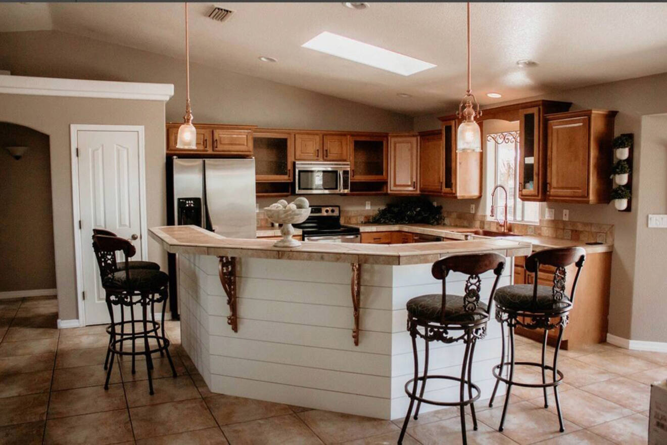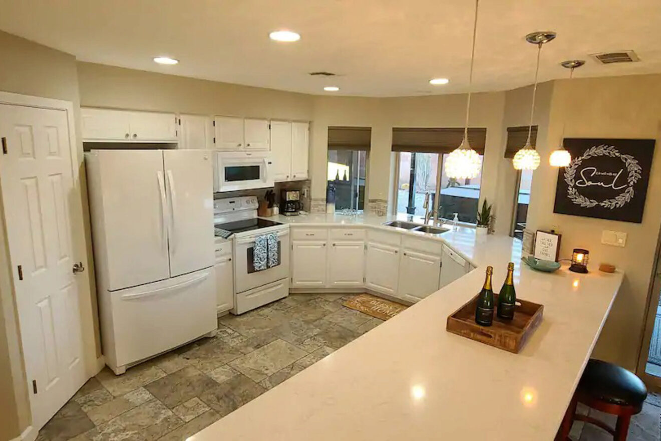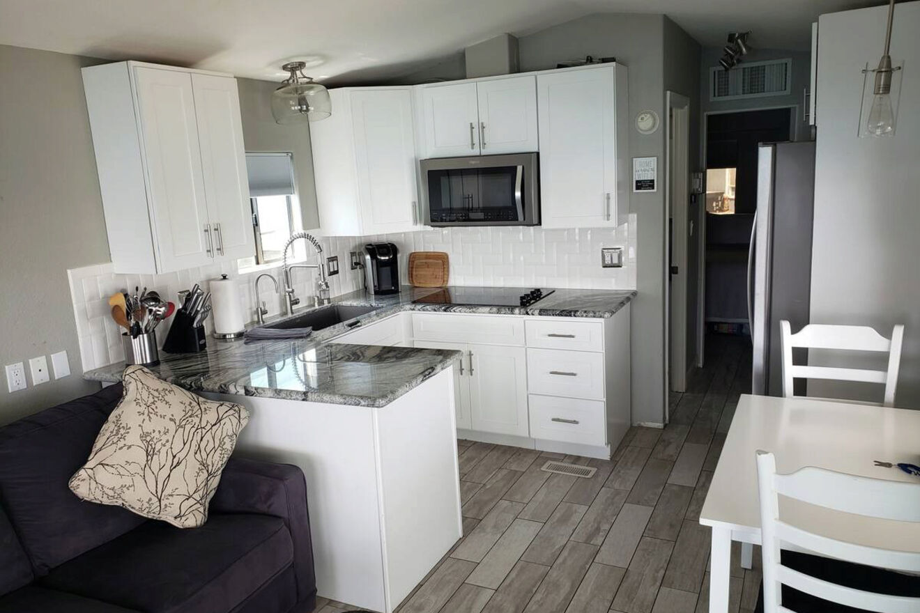 La única opción para dos huéspedes en mi lista, Luxury Casita, no solo es económica, sino que también ofrece un interior moderno y lujoso con amplio espacio para disfrutar de sus vacaciones en Lake Havasu City. Si desea preparar algo, la cocina está totalmente equipada con un refrigerador grande, estufa, horno y hermosas encimeras de granito.