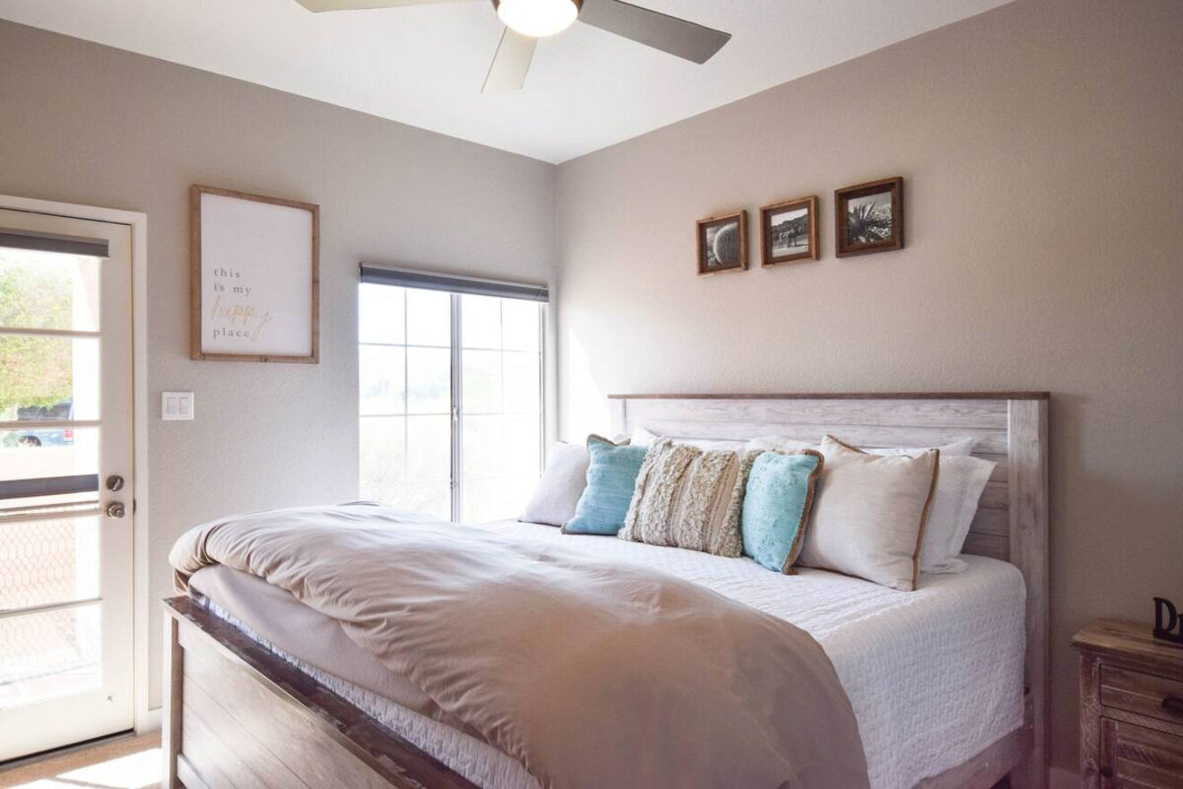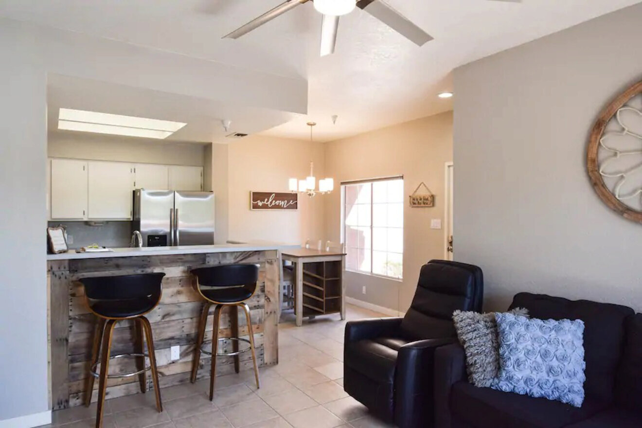 El Beachside Bungalow es un condominio de Airbnb ubicado en un moderno complejo cerca de todo lo que Lake Havasu tiene para ofrecer. Ya sea que desee ir al agua, al puente o a las diversas tiendas locales, puede simplemente subirse al paseo marítimo que lo lleva directamente al pueblo.
