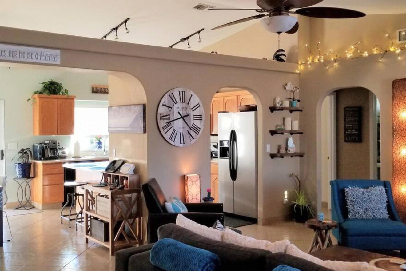 Una casa bellamente decorada y tu propia playa privada te esperan en este exótico Airbnb en Lake Havasu. En el interior encontrarás un amplio espacio abierto que incluye la cocina y la sala de estar. Pero la verdadera aventura está afuera.