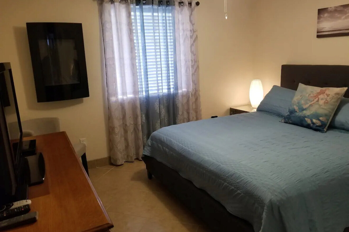 Este Airbnb es un lugar ideal para quienes buscan unas vacaciones en grupo. La casa principal cuenta con cuatro dormitorios, cada uno con televisor y aire acondicionado, ideal para ocho huéspedes. Dos niños disfrutarán de la aventura de dormir en literas en la pequeña cabaña junto a la piscina.