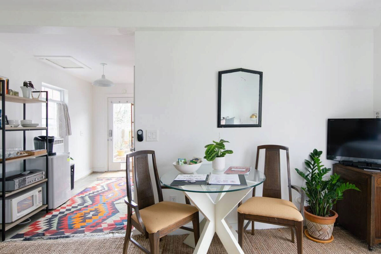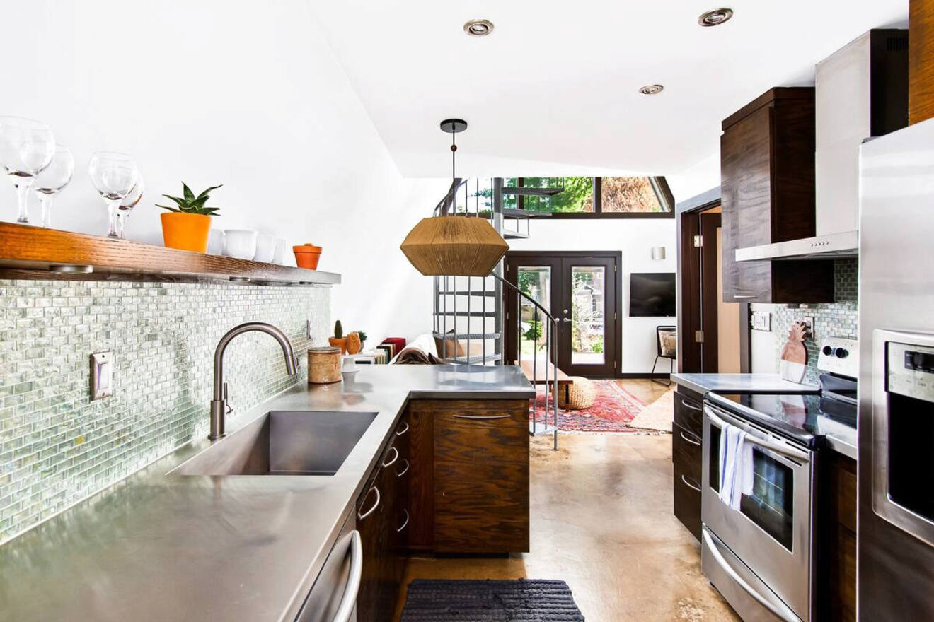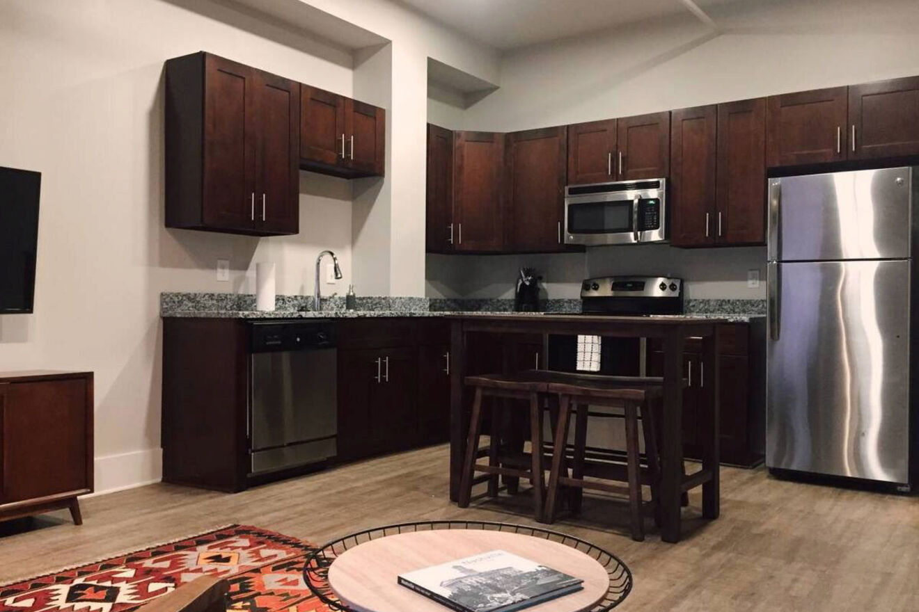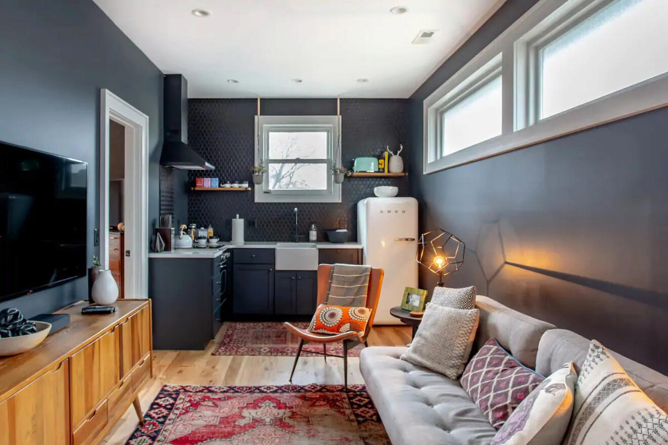 El estilo industrial chic está de moda hoy en día, y este elegante apartamento de una habitación en Nashville es un ejemplo brillante. Es un Airbnb impecable con elegantes muebles de mediados de siglo, techos altos y un mural artístico muy fotografiable en Instagram en la sala de estar.