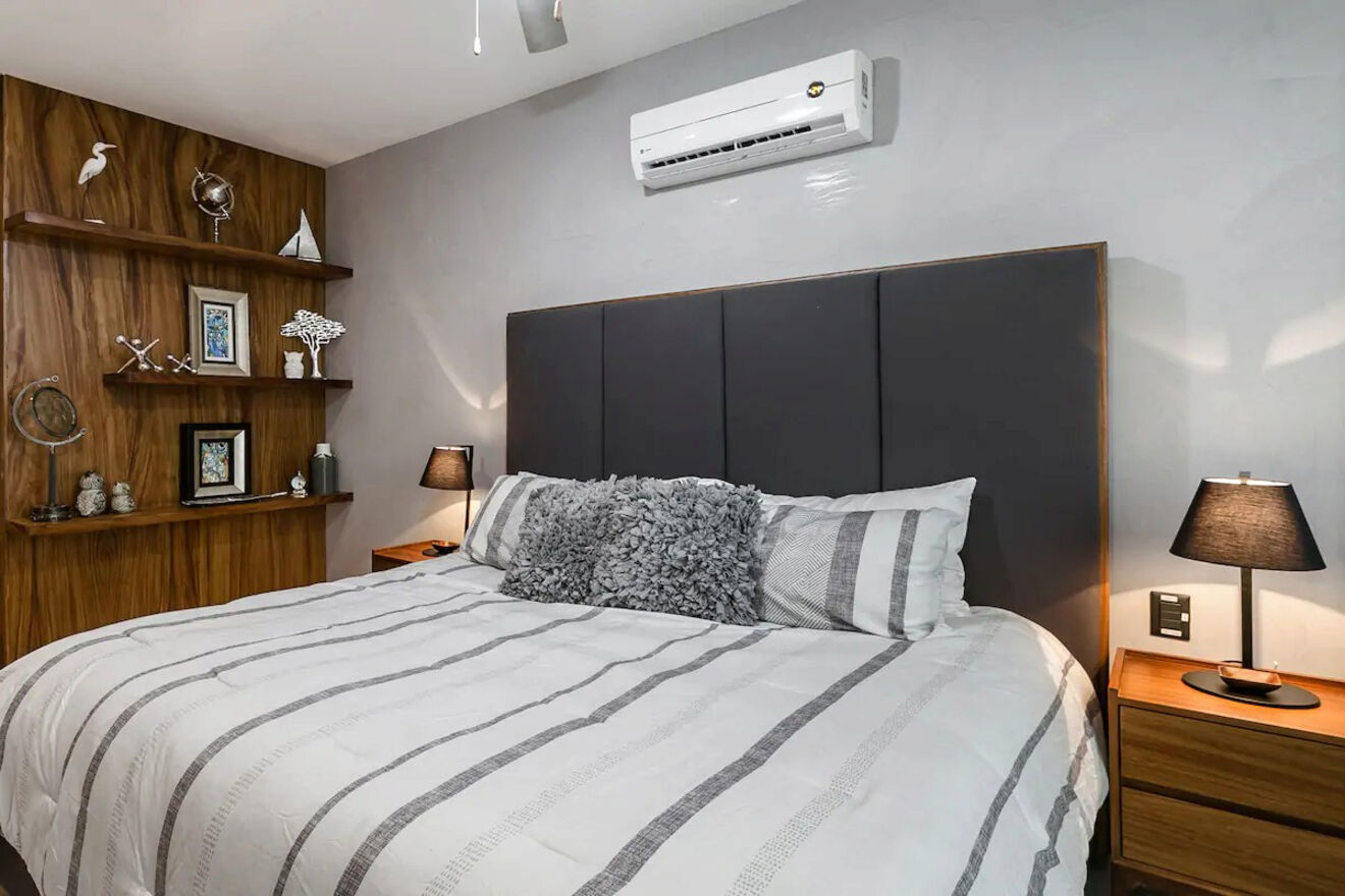 El diseño limpio de este Airbnb en Puerto Vallarta lo hace perfecto para parejas que desean un espacio íntimo pero también lo suficientemente espacioso para una familia de 5. Admira las coloridas obras de arte en las paredes o simplemente relájate y disfruta de tu serie favorita de Netflix.