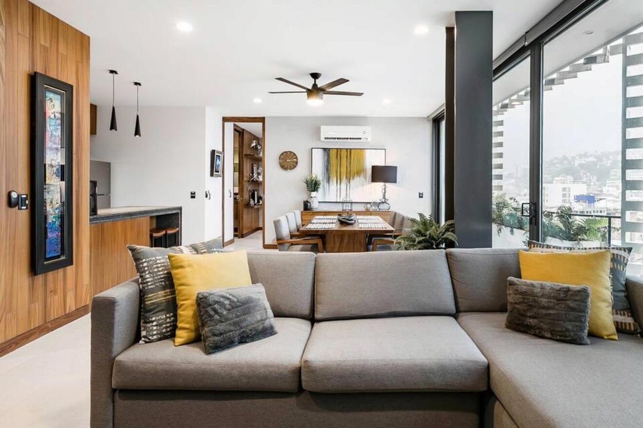 Disfruta de la vida contemporánea en este moderno y elegante Airbnb en Puerto Vallarta. Un diseño abierto, junto con muebles de madera y elegantes obras de arte, crea un ambiente moderno. Si no disfrutas de las vistas de la ciudad y la montaña desde el apartamento, puedes subir al último piso para disfrutar de las impresionantes vistas de la Bahía de Banderas o darte un chapuzón en la piscina infinita. El impecable gimnasio también tiene vistas a la montaña, ¡lo que hará que tus entrenamientos sean mucho más placenteros!