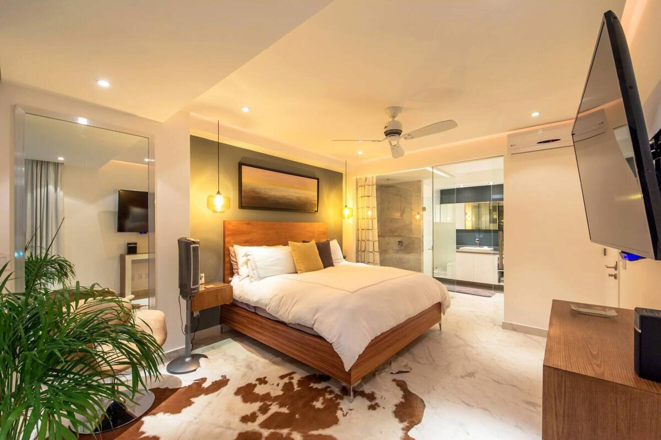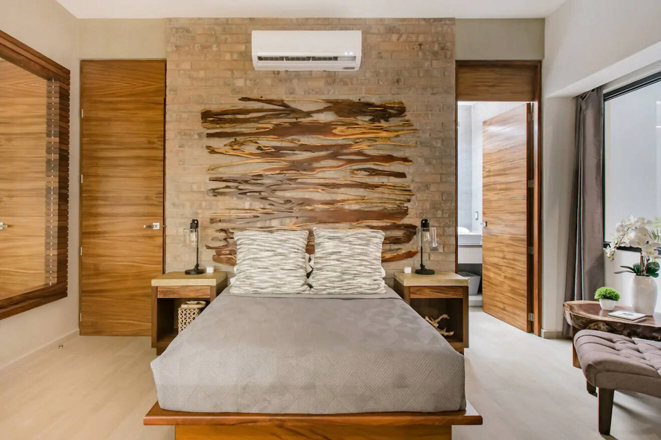 Este impecable estudio en Puerto Vallarta es una joya escondida y el lugar perfecto para recargar energías durante tus vacaciones en México. La paleta de colores neutros se complementa con muebles de madera, adornos budistas y varias plantas, creando un ambiente relajante.