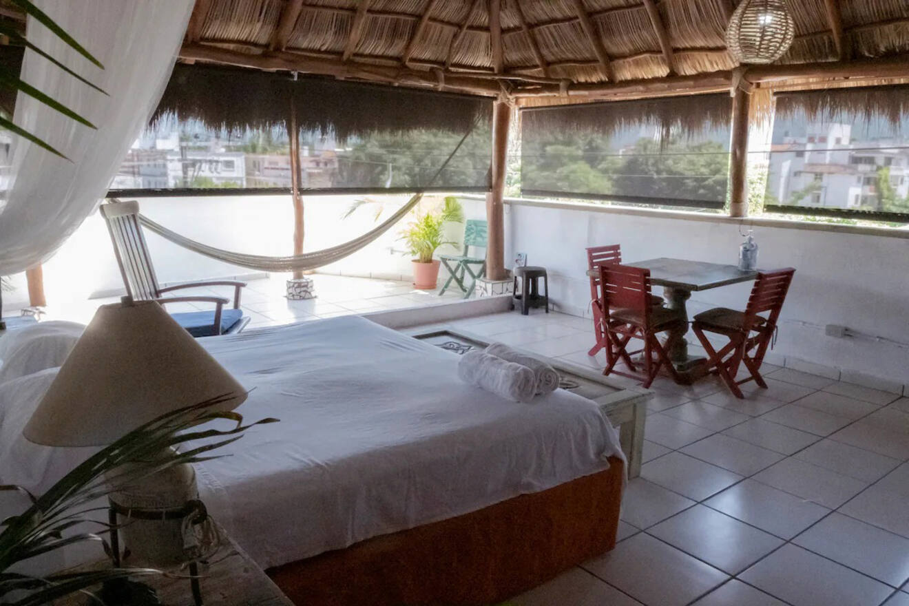 La característica más singular de este Airbnb es que ¡no tiene ventanas! Sí, leíste bien: este estudio Airbnb en Puerto Vallarta es completamente al aire libre. En lugar de paredes y ventanas, este alojamiento único utiliza persianas para crear un espacio privado.