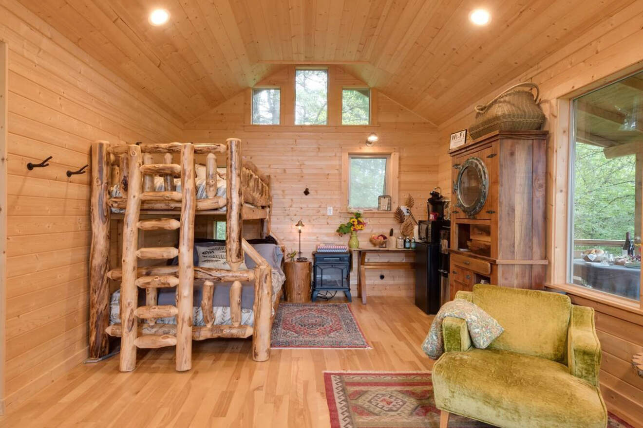 Un hogar lejos de casa, el interior de la casa del árbol es elegante con toques audaces. Las bases de las camas son de madera maciza y le dan a la casa un aire de grandeza y lujo. El diseño abierto ofrece espacio suficiente para seis personas en una litera doble y una cama tamaño queen independiente.